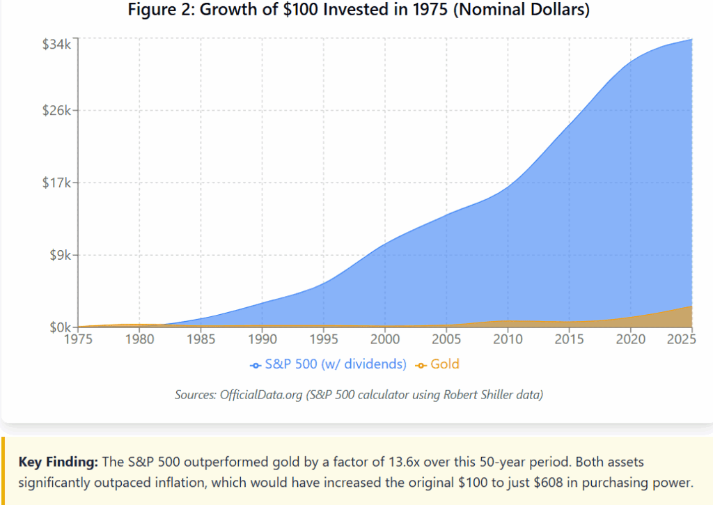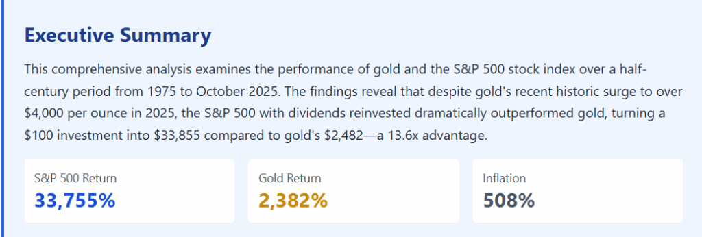 This comprehensive 50-year analysis demonstrates that while both gold and the S&P 500 have provided positive real returns and wealth preservation, equities have been the dramatically superior vehicle for long-term wealth creation. An investor who placed $100 in an S&P 500 index fund in 1975 and reinvested dividends would have 13.6 times more wealth than an investor who purchased gold.