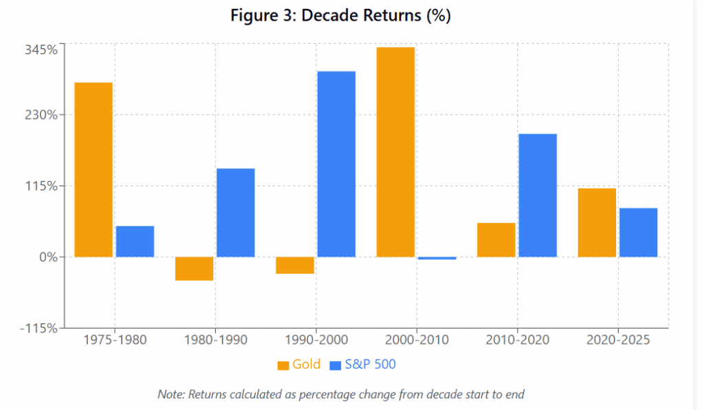 Breaking down the performance by decade reveals periods of divergent performance. Gold excelled during the inflationary 1970s and the commodity boom of the 2000s, while the S&P 500 dominated during most other periods.