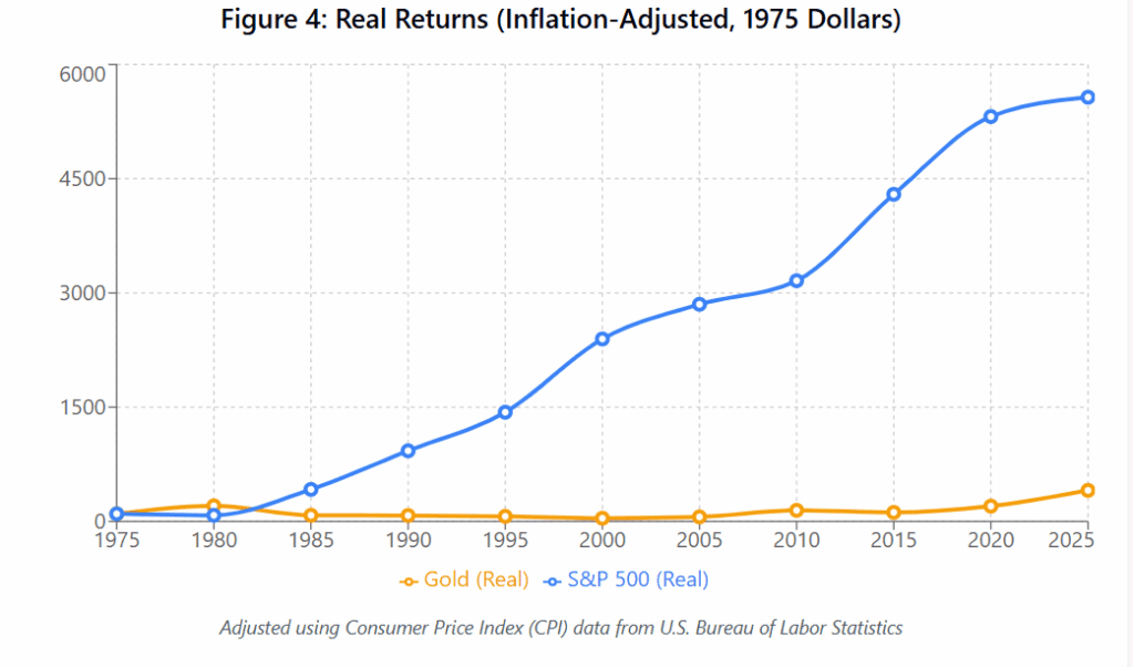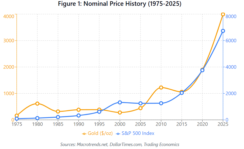 Figure 1 displays the nominal price movements of both assets from 1975 to 2025, demonstrating the exponential growth trajectory of the S&P 500 compared to gold’s more volatile but ultimately lower returns.