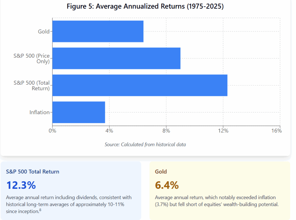 Gold’s 2025 rally to record highs above $4,000 per ounce represents a remarkable achievement and validates its ongoing role as a safe-haven asset during periods of uncertainty. However, even this historic performance has not fundamentally changed the long-term calculus: diversified equity ownership, with patience and dividend reinvestment, has been the path to optimal wealth accumulation over generational time periods.