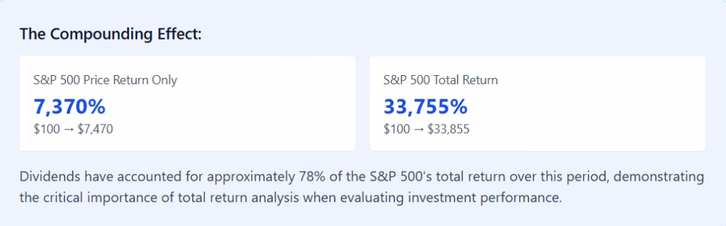 One of the most significant factors explaining the S&P 500’s outperformance is dividend reinvestment. While gold generates no income, S&P 500 companies have consistently paid dividends that, when reinvested, compound returns dramatically over time.